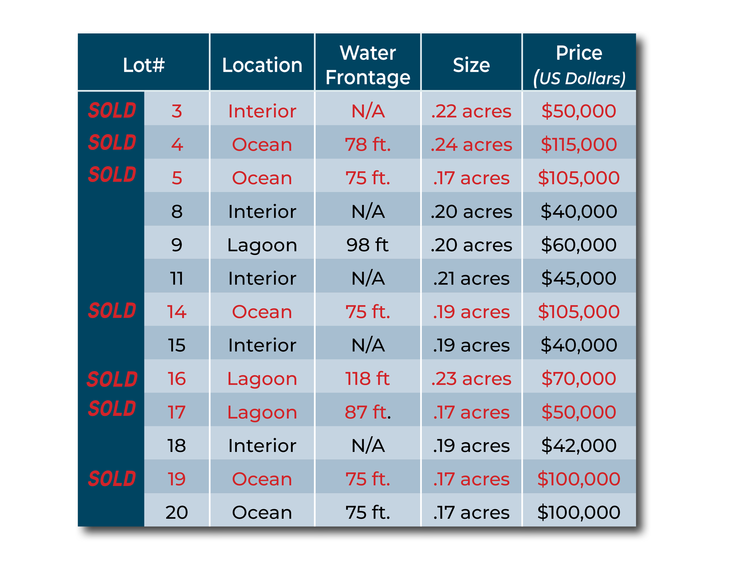 Review the lot and/or cabaña availability and pricing.